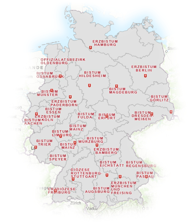 Weitere Karten und Kontaktdaten der jeweiligen (Erz-)Bistümer finden Sie unter Bistumskarten.